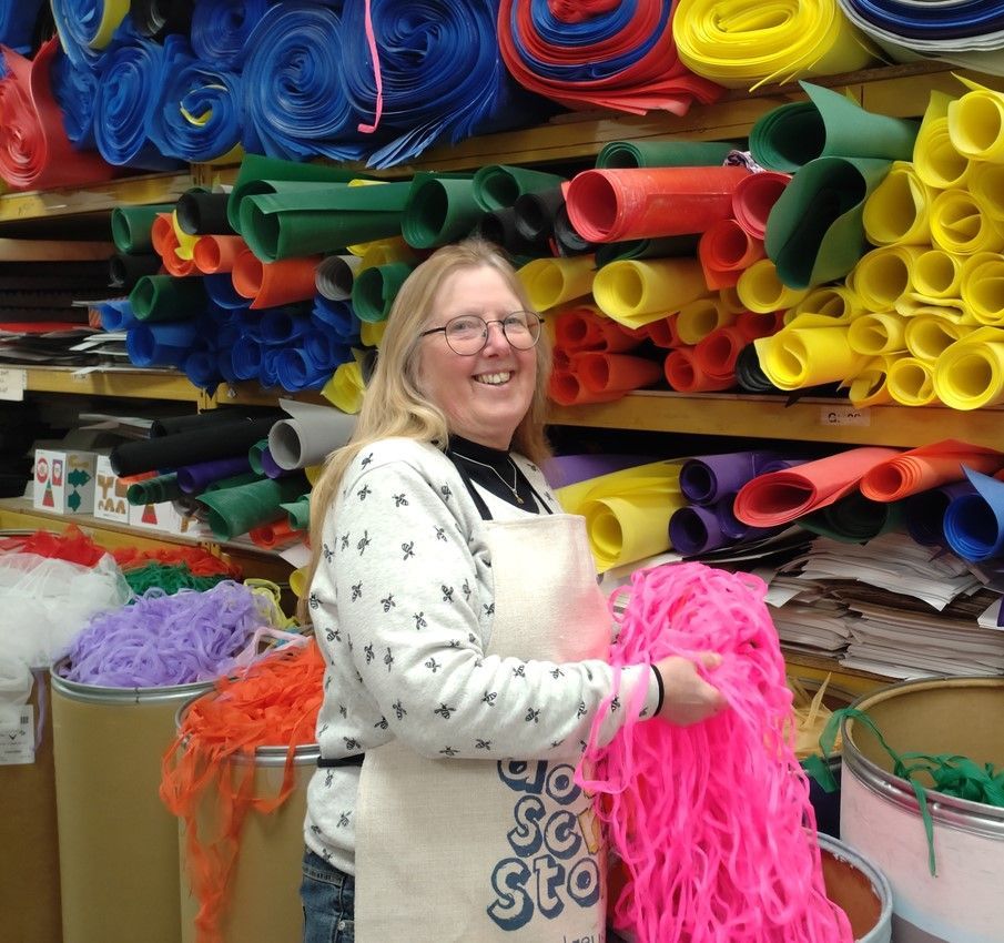 Carolyn goes to the Scrapstore once a week to help people pick out their crafting materials, maintaining the stock levels and helping to sort donations.